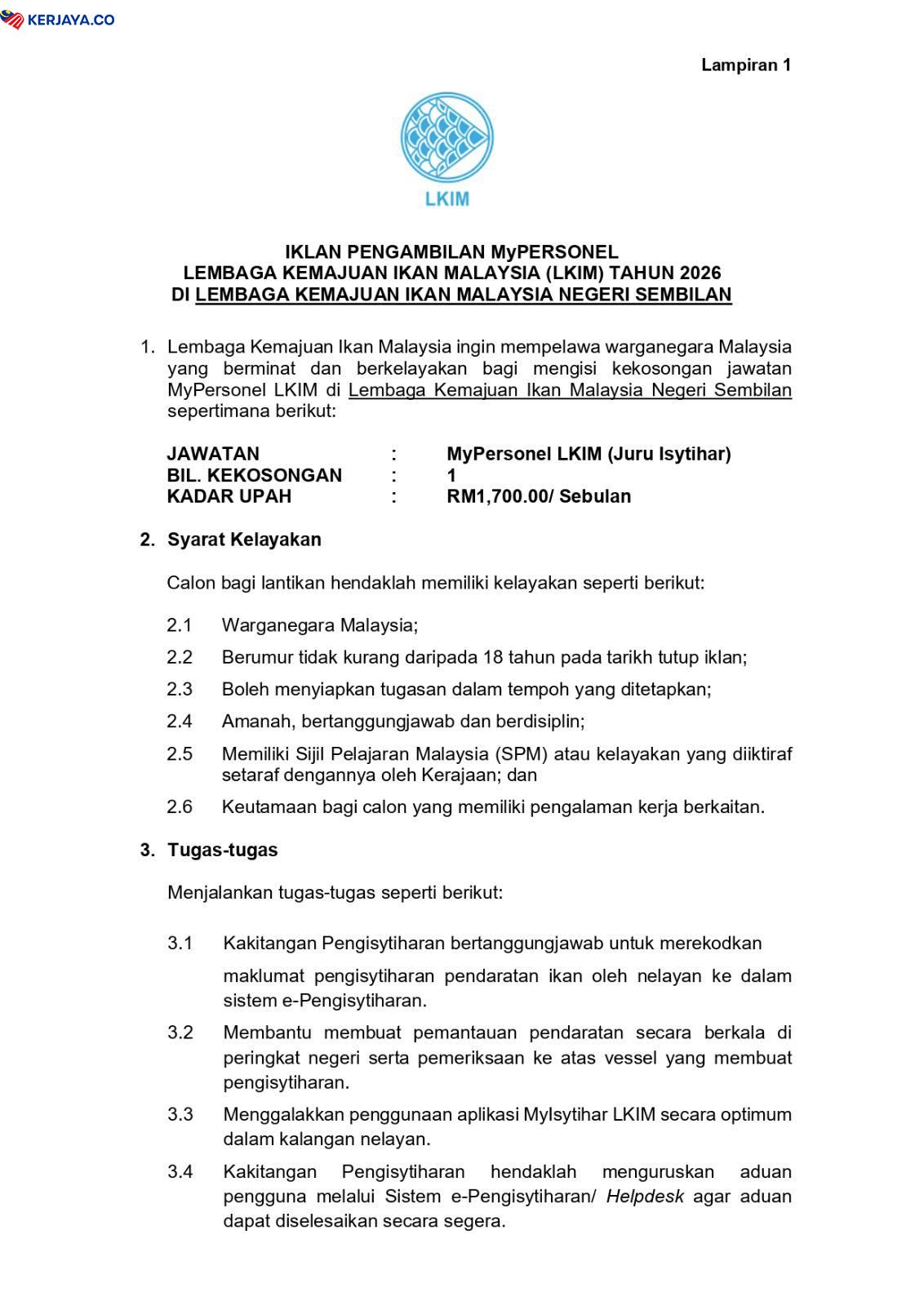Iklan Jawatan Lembaga Kemajuan Ikan Malaysia (LKIM)