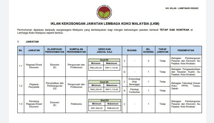Iklan Jawatan Lembaga Koko Malaysia