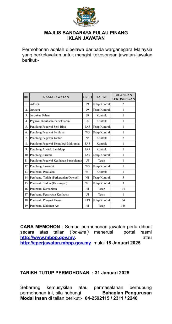 Iklan Jawatan Majlis Bandaraya Pulau Pinang (MBPP)