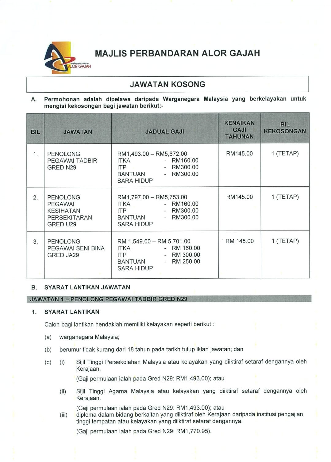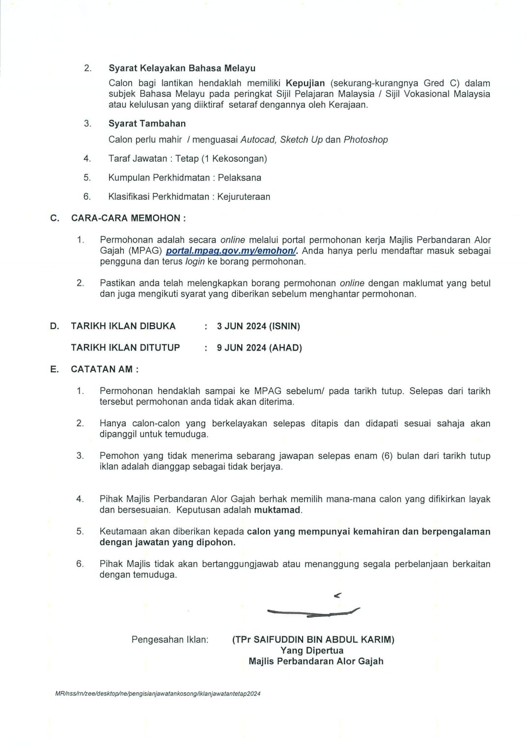Iklan Jawatan Majlis Perbandaran Alor Gajah (MPAG)