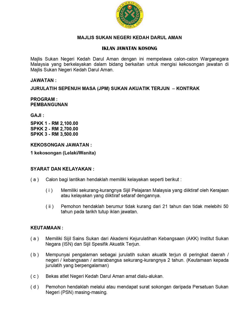 Iklan Jawatan Majlis Sukan Negeri Kedah (MSNK)