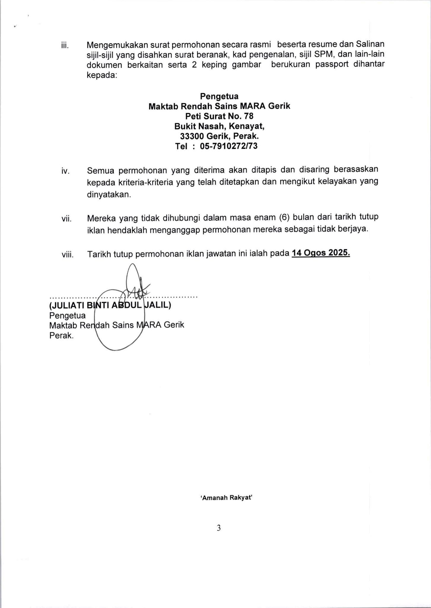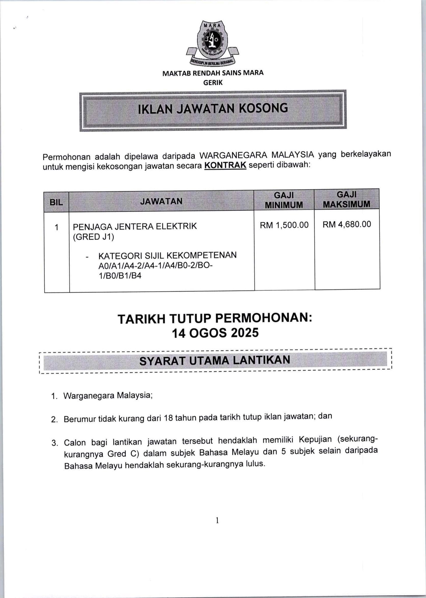 Iklan Jawatan Maktab Rendah Sains MARA Gerik