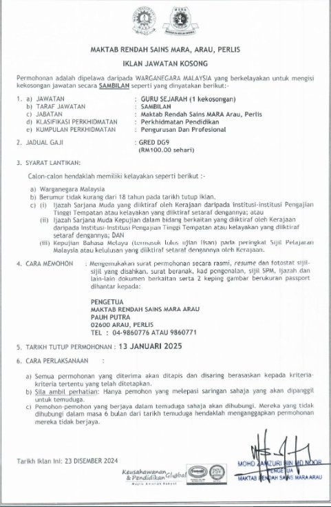 Iklan Jawatan Maktab Rendah Sains MARA (MRSM) Arau