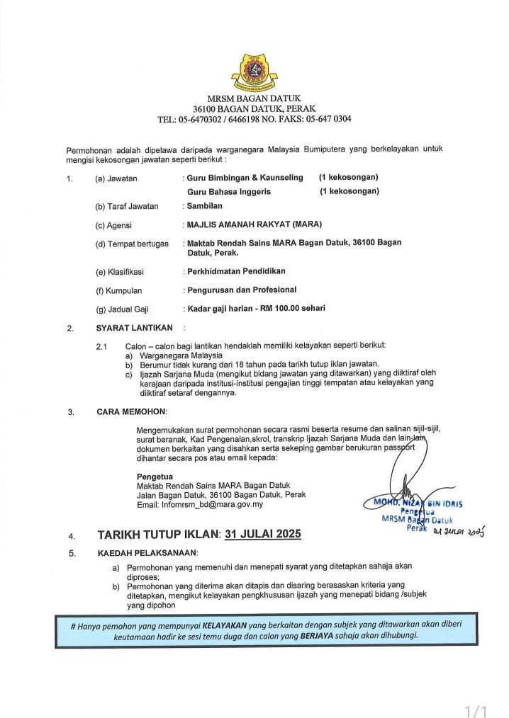 IKLAN JAWATAN MAKTAB RENDAH SAINS MARA (MRSM) BAGAN DATUK
