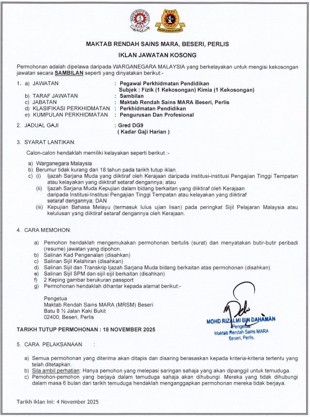 Iklan Jawatan Maktab Rendah Sains Mara (MRSM) Beseri