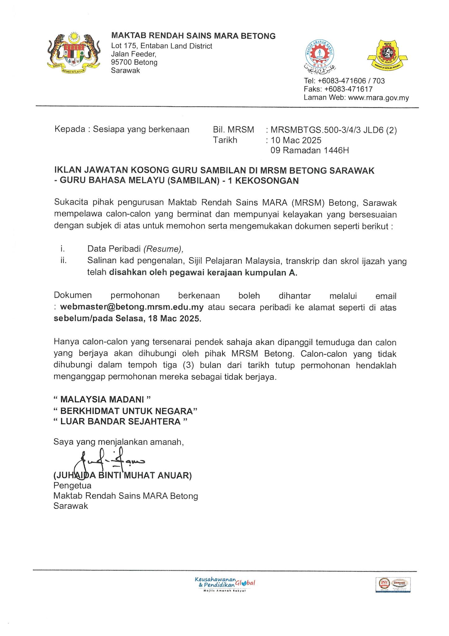 Iklan Jawatan Maktab Rendah Sains MARA (MRSM) Betong