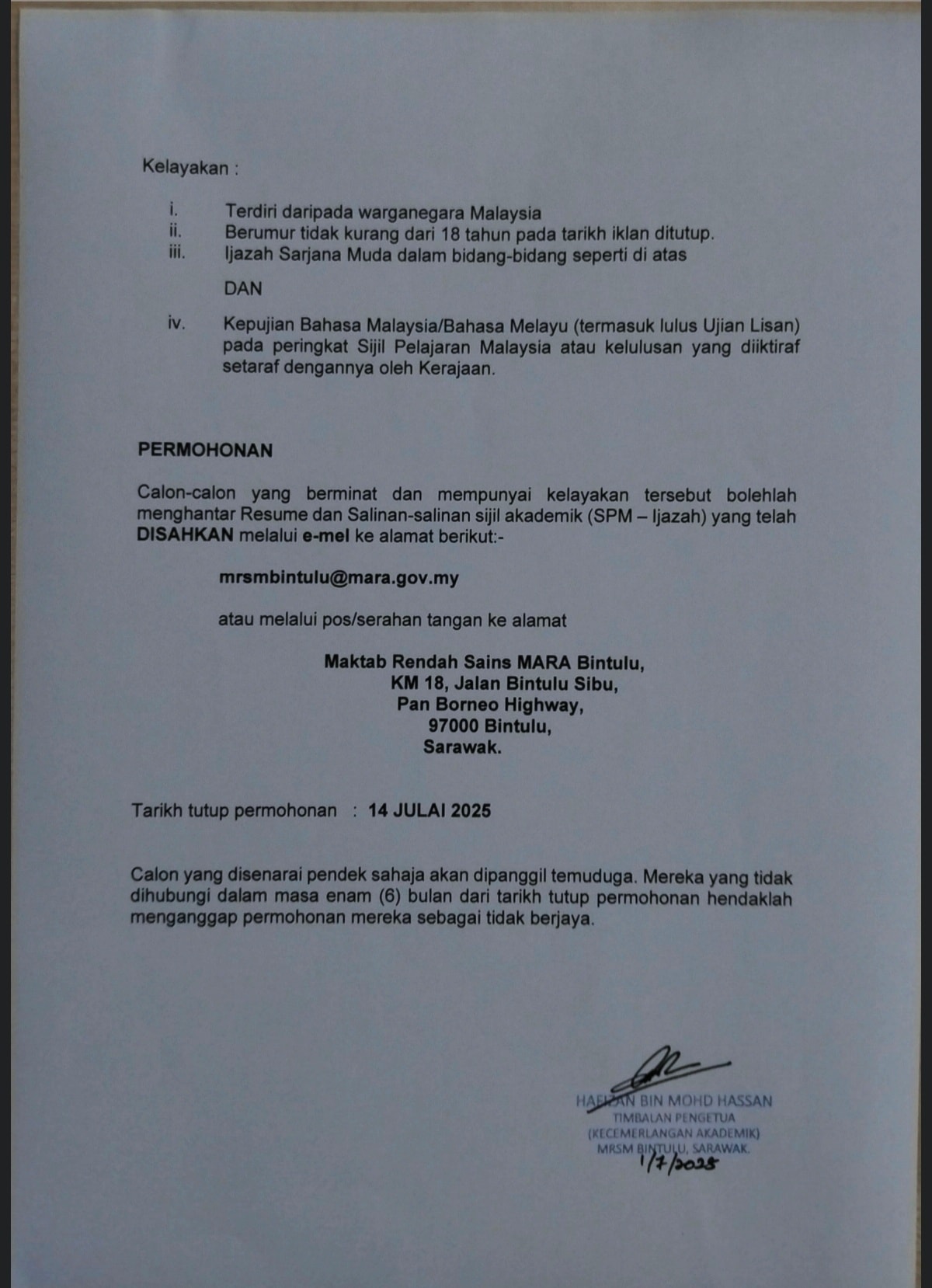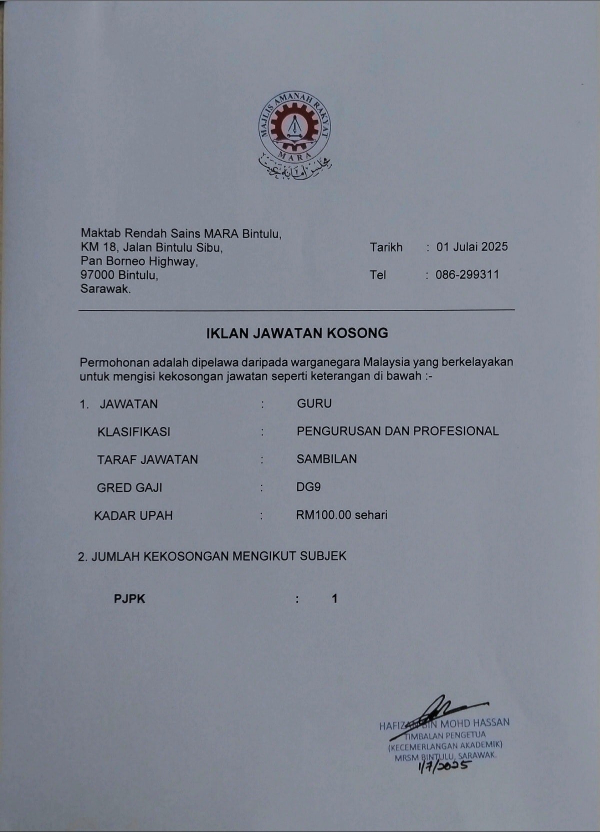 Iklan Jawatan Maktab Rendah Sains MARA (MRSM) Bintulu
