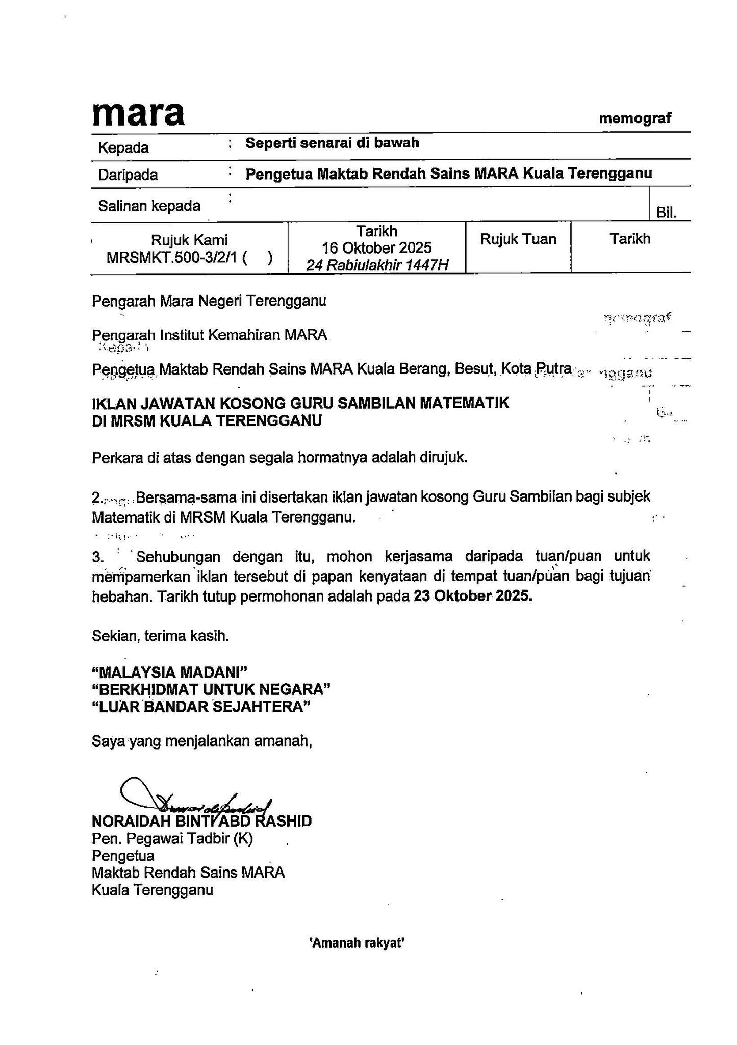 Iklan Jawatan Maktab Rendah Sains Mara (MRSM) Kuala Terengganu