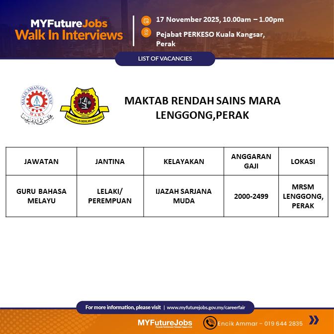 Iklan Jawatan Maktab Rendah Sains Mara (MRSM) Lenggong