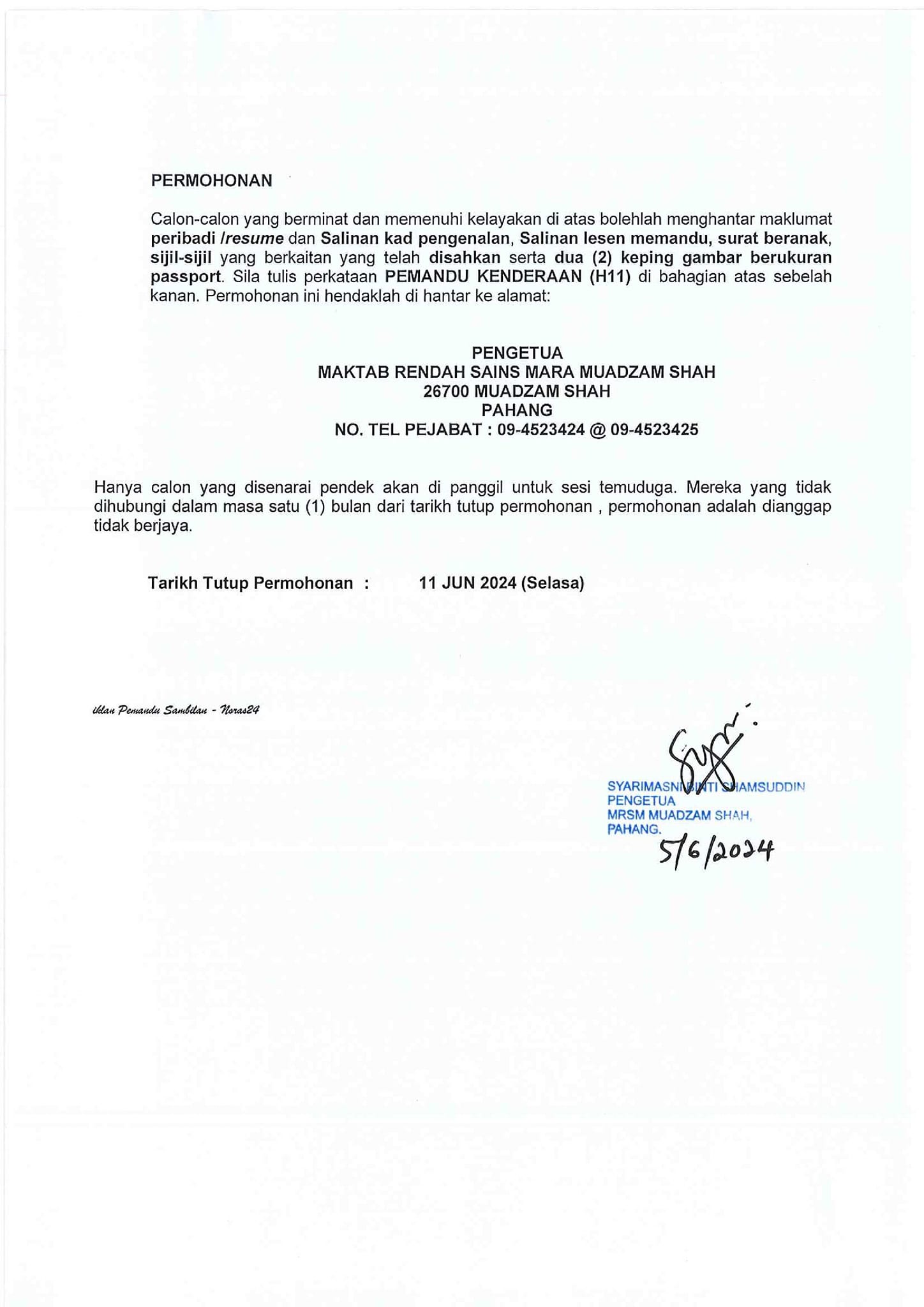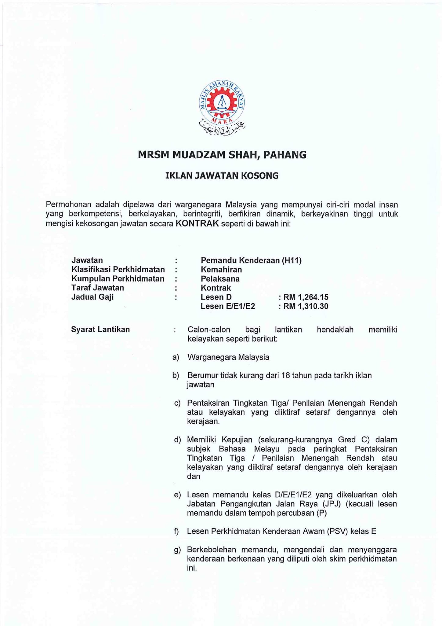 Iklan Jawatan Maktab Rendah Sains Mara (MRSM) Muadzam Shah