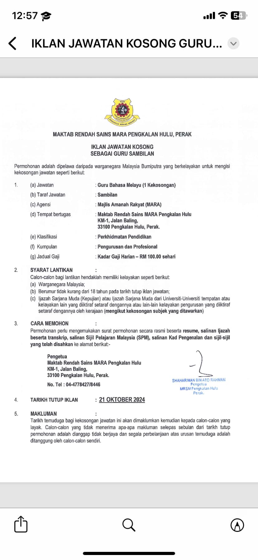 Iklan Jawatan Maktab Rendah Sains MARA (MRSM) Pengkalan Hulu