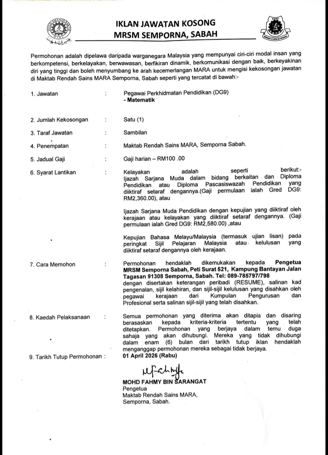 Iklan Jawatan Maktab Rendah Sains MARA (MRSM) Semporna ~ Jawatan Kosong Pegawai Perkhidmatan Pendidikan (DG9)