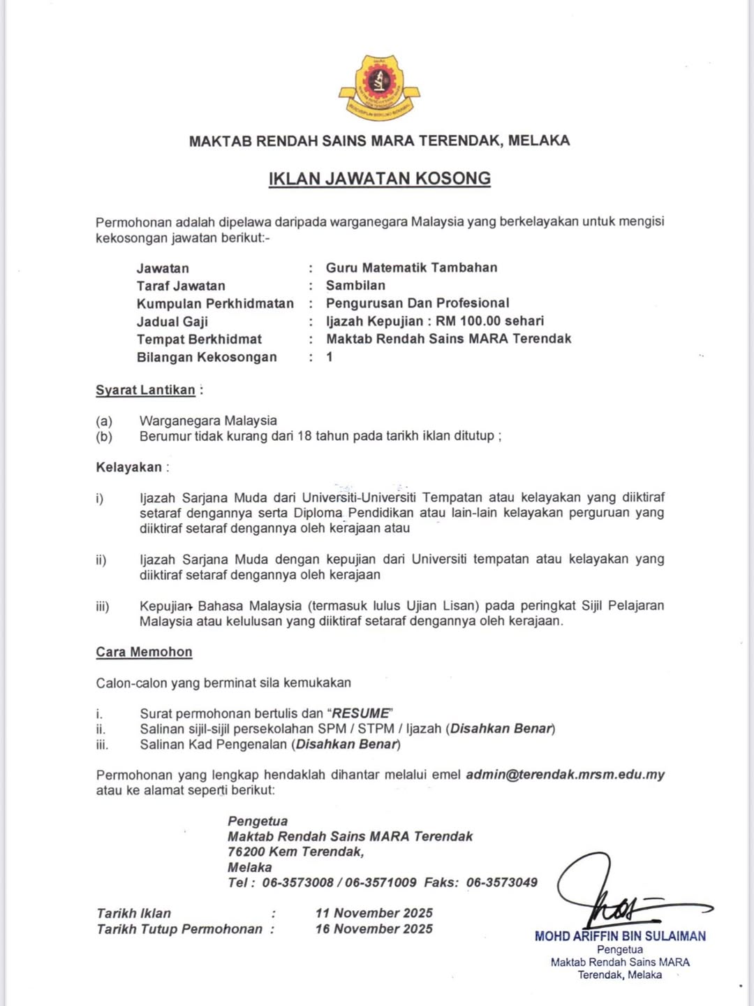 Iklan Jawatan Maktab Rendah Sains Mara (MRSM) Terendak