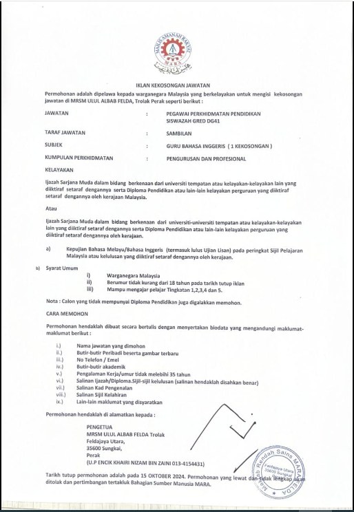 Iklan Jawatan Maktab Rendah Sains Mara (MRSM) Ulul Albab Felda Trolak