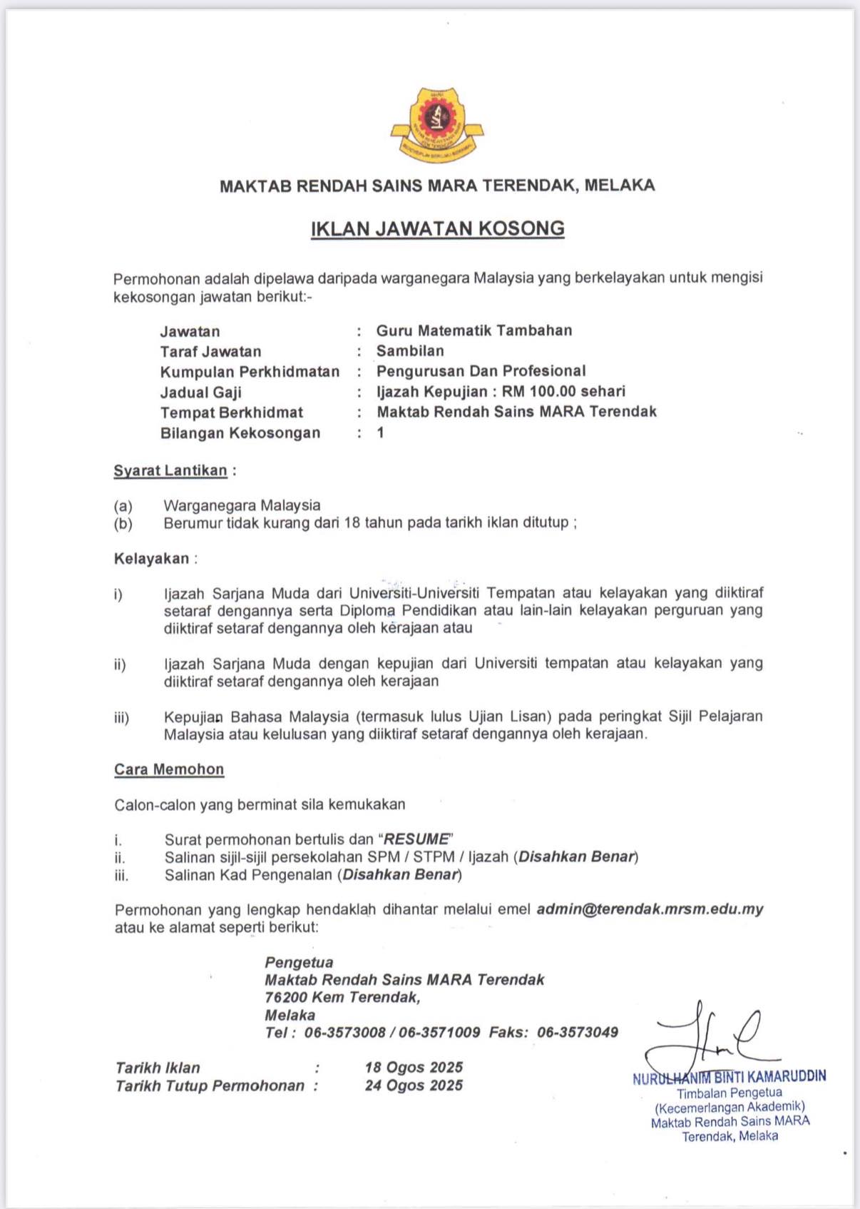 Iklan Jawatan Maktab Rendah Sains MARA Terendak