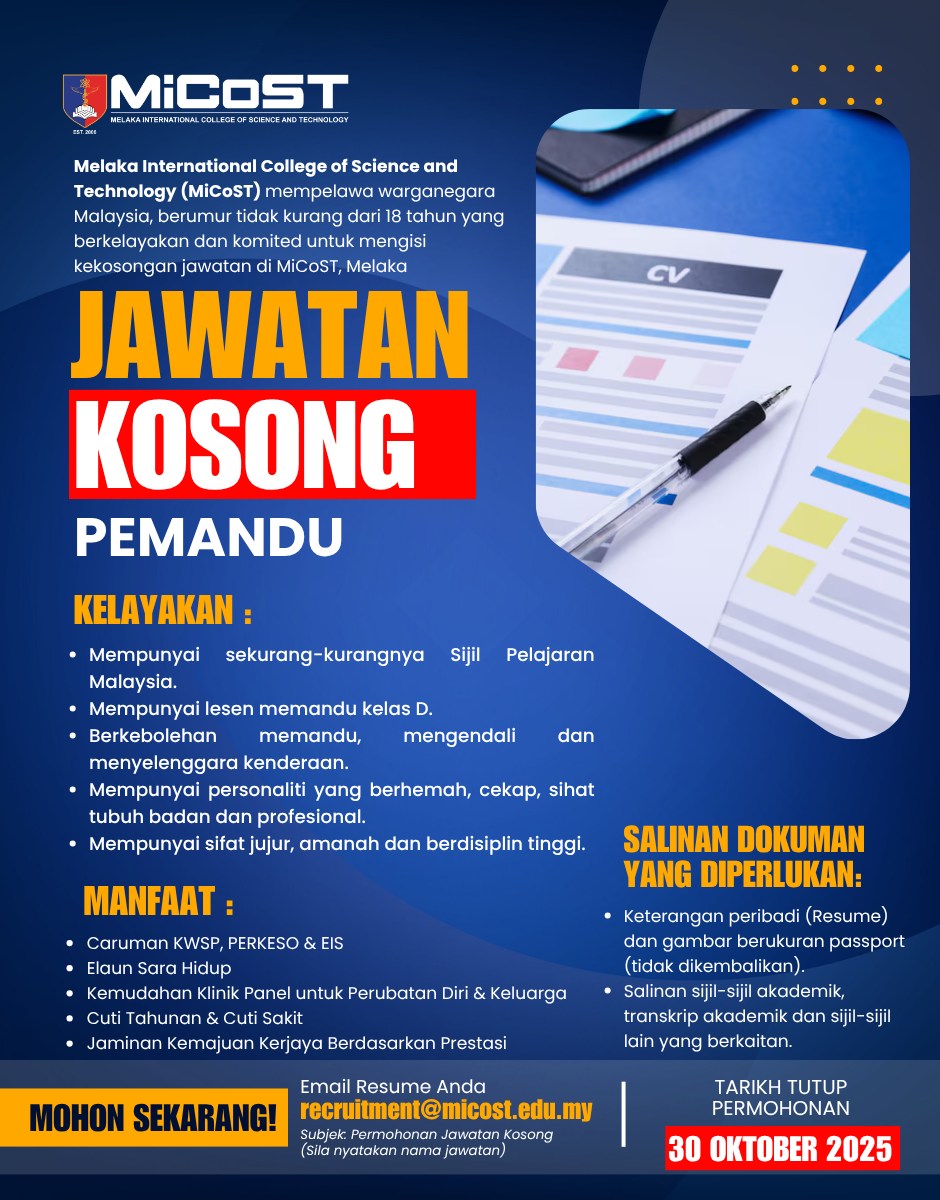 Iklan Jawatan Melaka International College of Science and Technology (MiCoST)