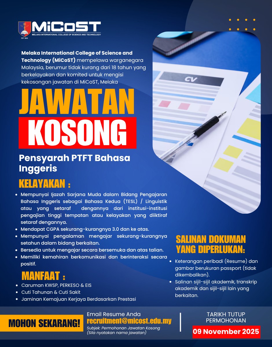 Iklan Jawatan Melaka International College Of Science And Technology (MiCoST)