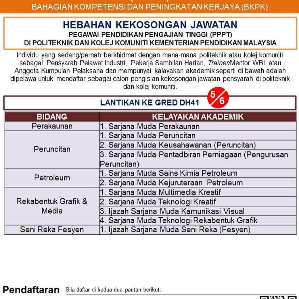 HEBAHAN IKLAN PENGAMBILAN JAWATAN PEGAWAI PENDIDIKAN PENGAJIAN TINGGI GRED LANTIKAN DH29/ DH41/ DH47 DI POLITEKNIK DAN KOLEJ KOMUNITI