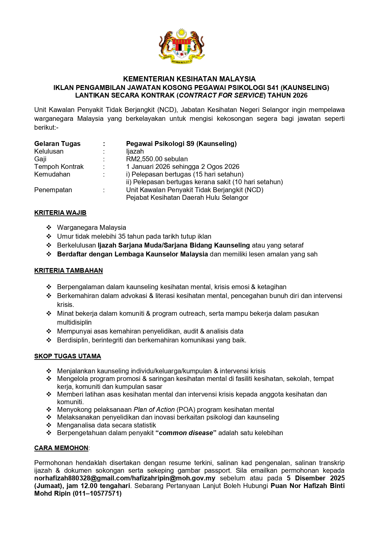 Iklan Jawatan Pejabat Kesihatan Daerah Hulu Selangor