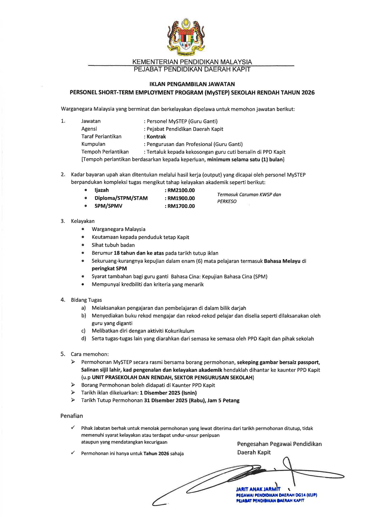 Iklan Jawatan Pejabat Pendidikan Daerah Kapit