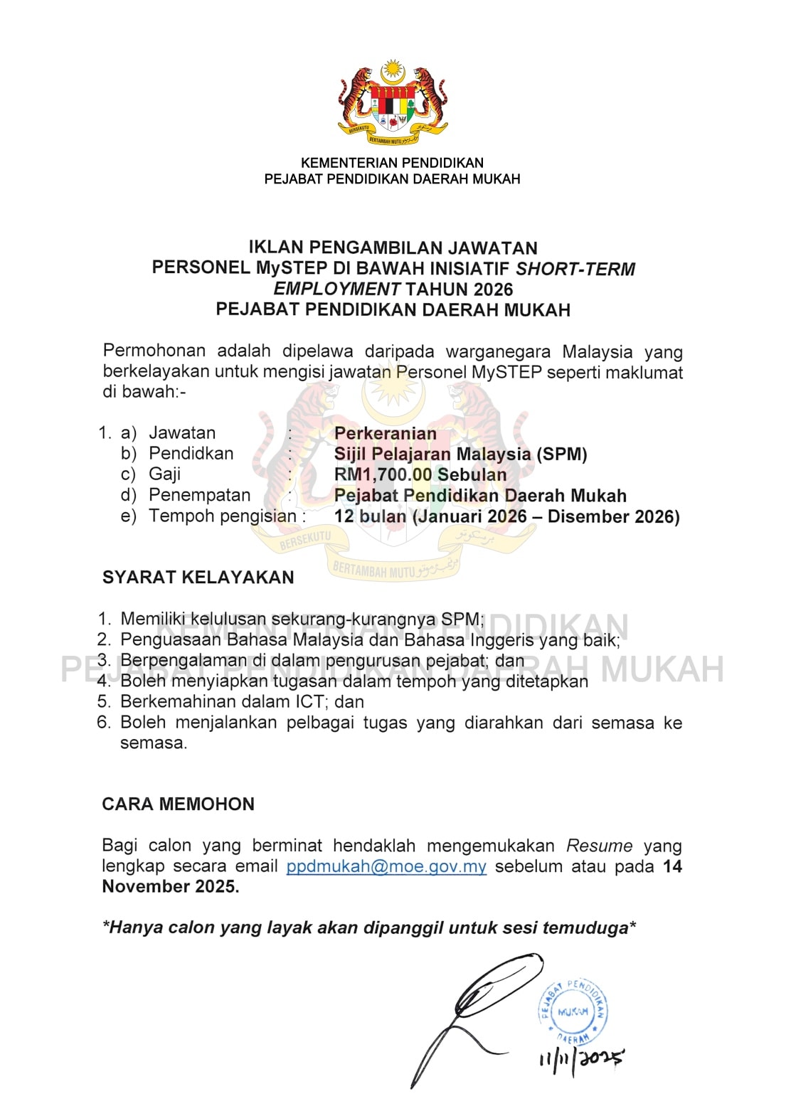 Iklan Jawatan Pejabat Pendidikan Daerah Mukah