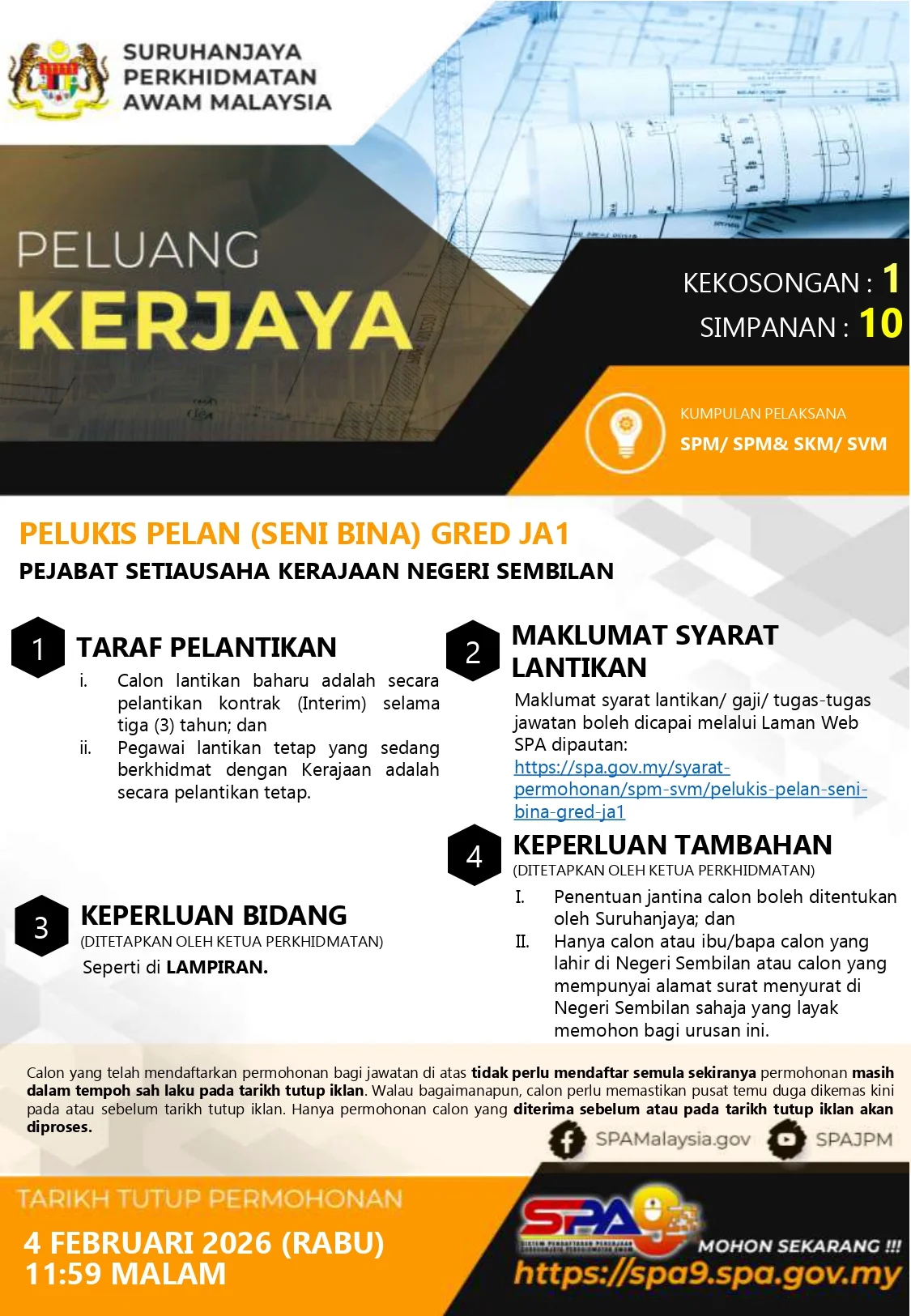 Portal Kerjaya / MANUAL / IKLAN JAWATAN PEJABAT SETIAUSAHA KERAJAAN NEGERI SEMBILAN (SUK NEGERI SEMBILAN) ~ JAWATAN KOSONG PELUKIS PELAN (SENI BINA) GRED JA1