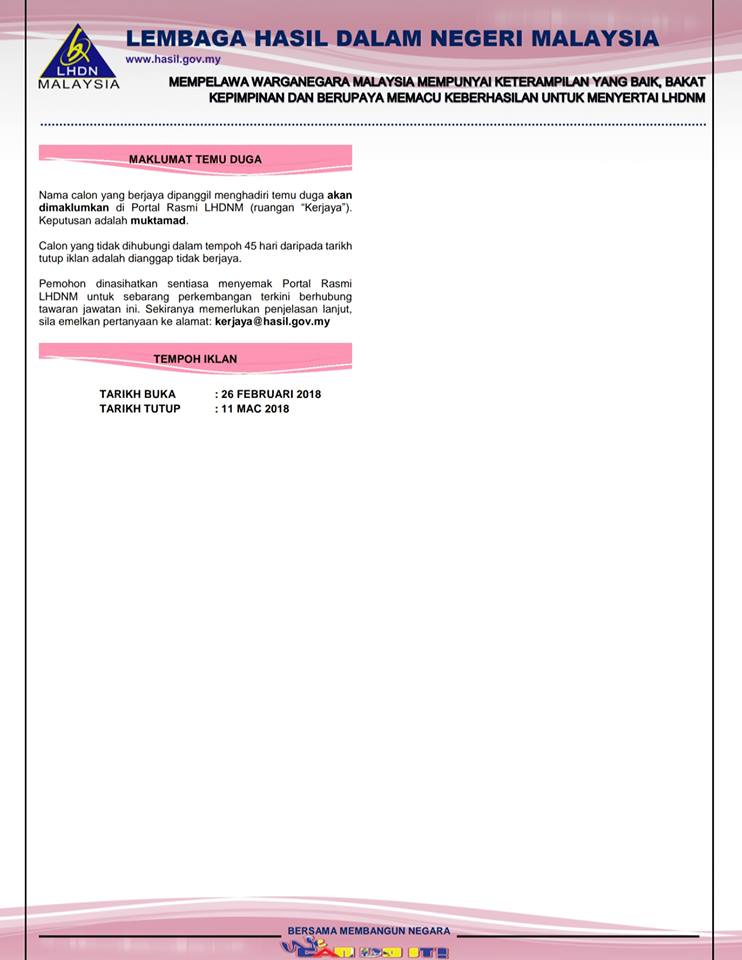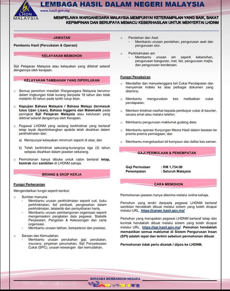 Iklan Jawatan Pembantu Hasil Percukaian & Operasi LHDN Berikut merupakan Iklan Jawatan Pembantu Hasil Percukaian & Operasi LHDN seperti yang diiklankan. Rujuk iklan permohonan di bawah untuk maklumat lanjut mengemukakan permohonan anda.