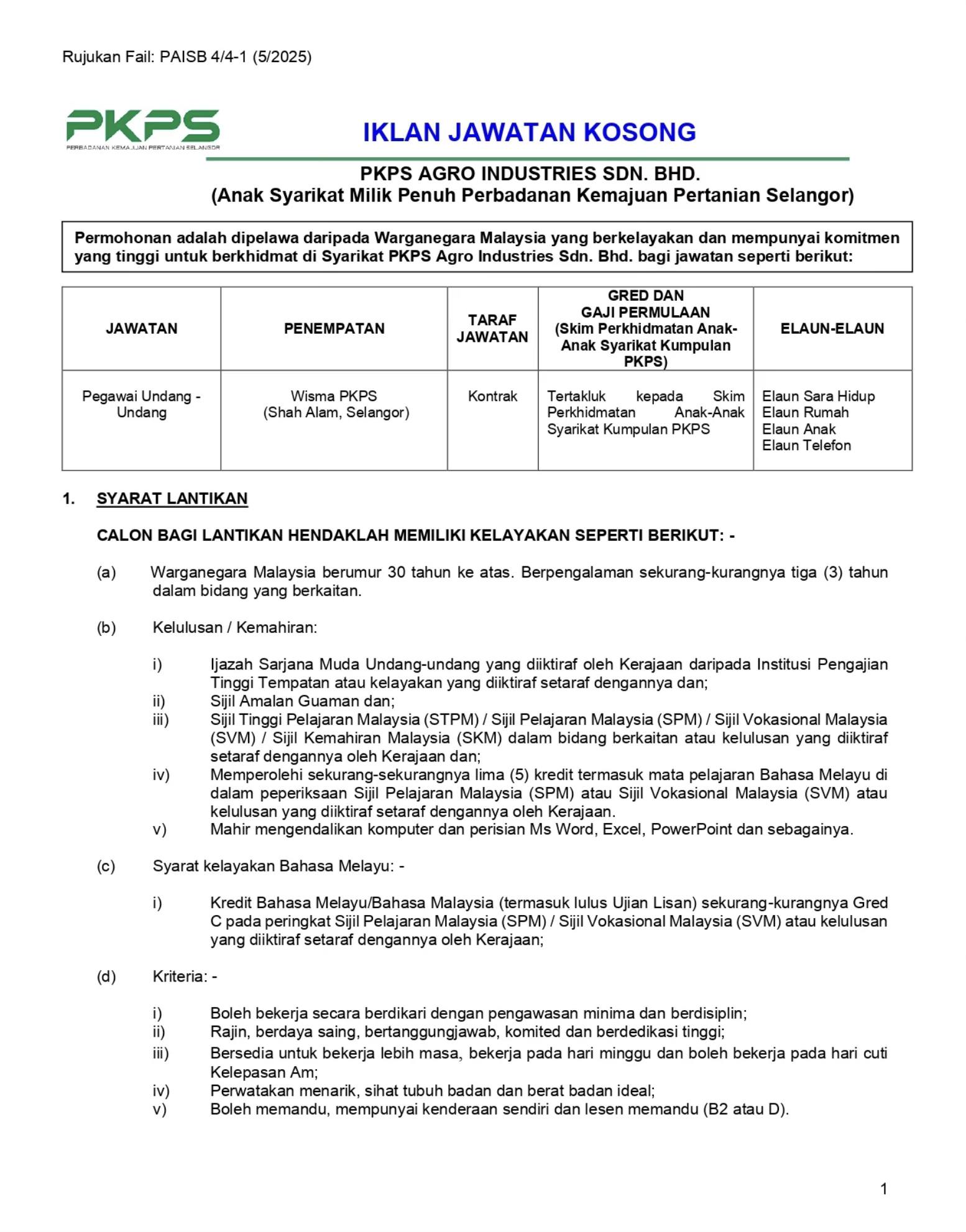 Iklan Jawatan Perbadanan Kemajuan Pertanian Selangor (PKPS)