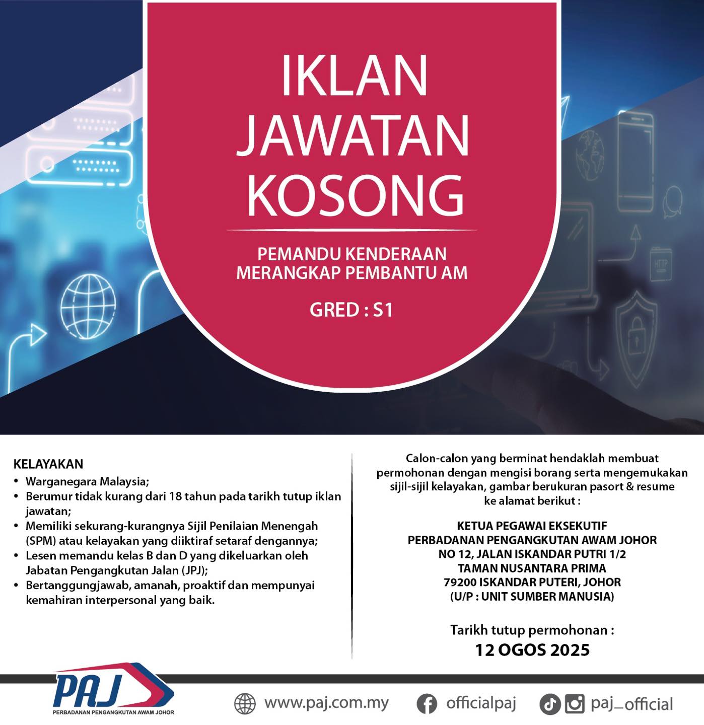 Iklan Jawatan Perbadanan Pengangkutan Awam Johor (PAJ)