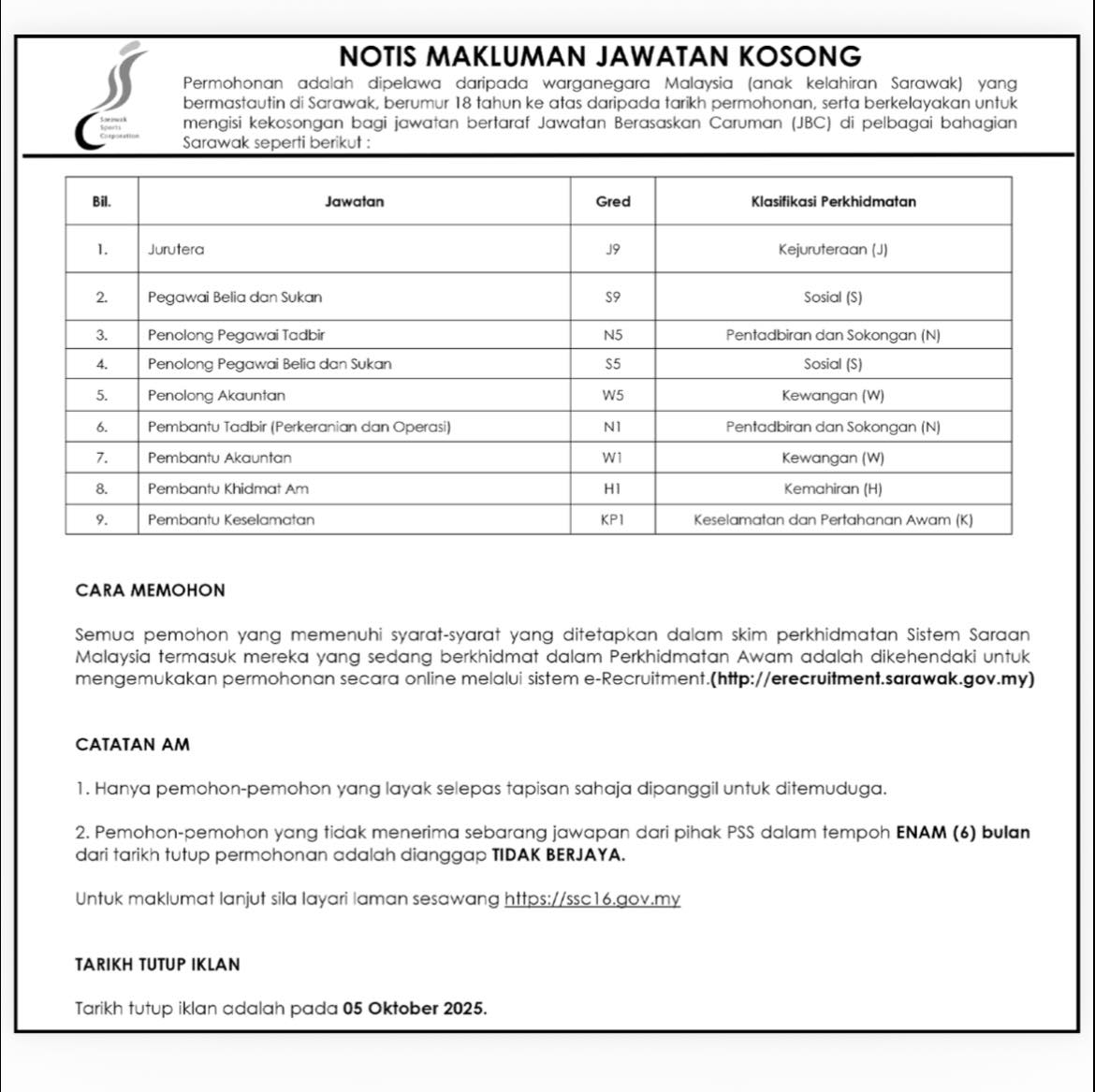 Iklan Jawatan Perbadanan Sukan Sarawak (SSC)