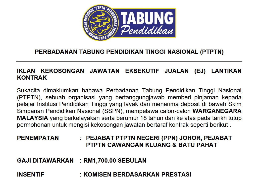 Iklan Jawatan Perbadanan Tabung Pendidikan Tinggi Nasional (PTPTN)