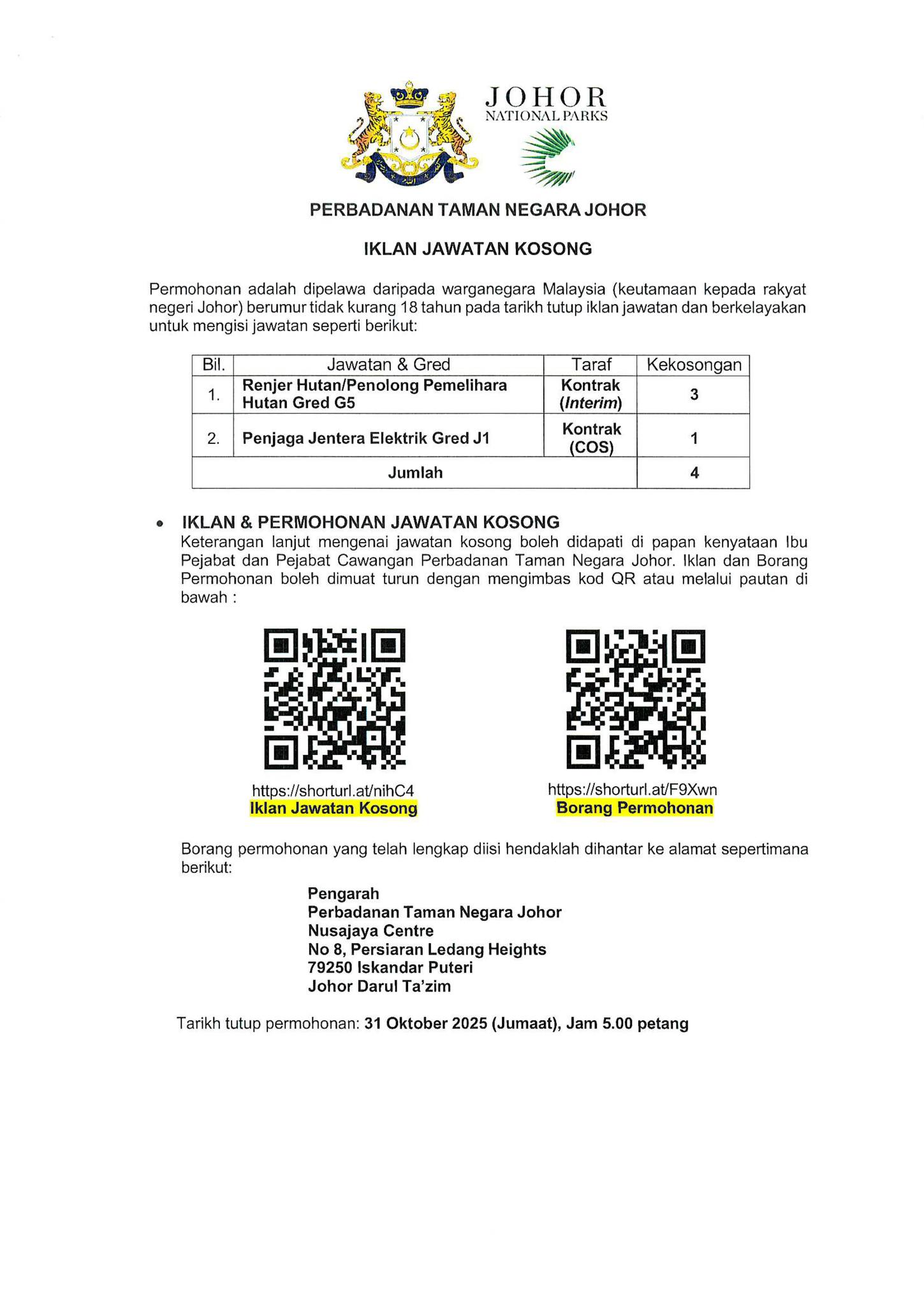Iklan Jawatan Perbadanan Taman Negara Johor