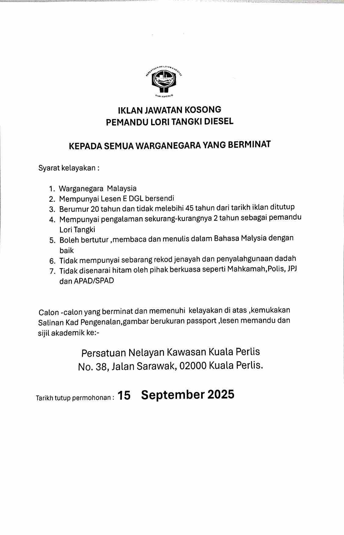 Iklan Jawatan Persatuan Nelayan Kawasan Kuala Perlis