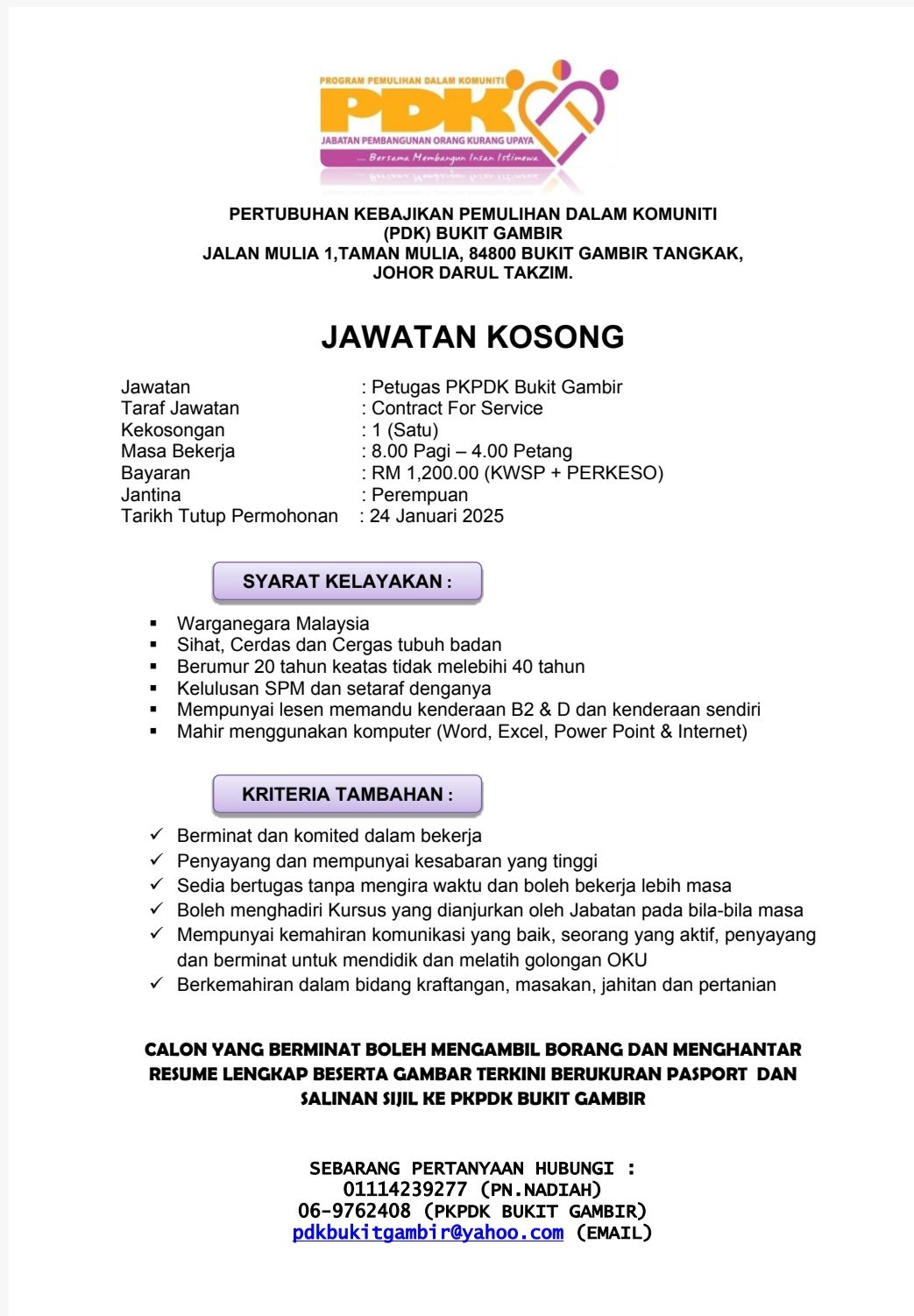 Iklan Jawatan Pertubuhan Kebajikan Pemulihan Dalam Komuniti (PDK) Bukit Gambir