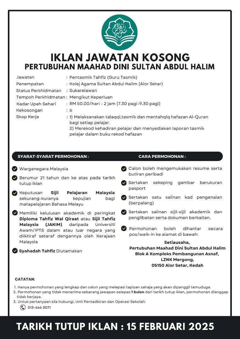 Portal Kerjaya / MANUAL / IKLAN JAWATAN PERTUBUHAN MAAHAD DINI SULTAN ABDUL HALIM
