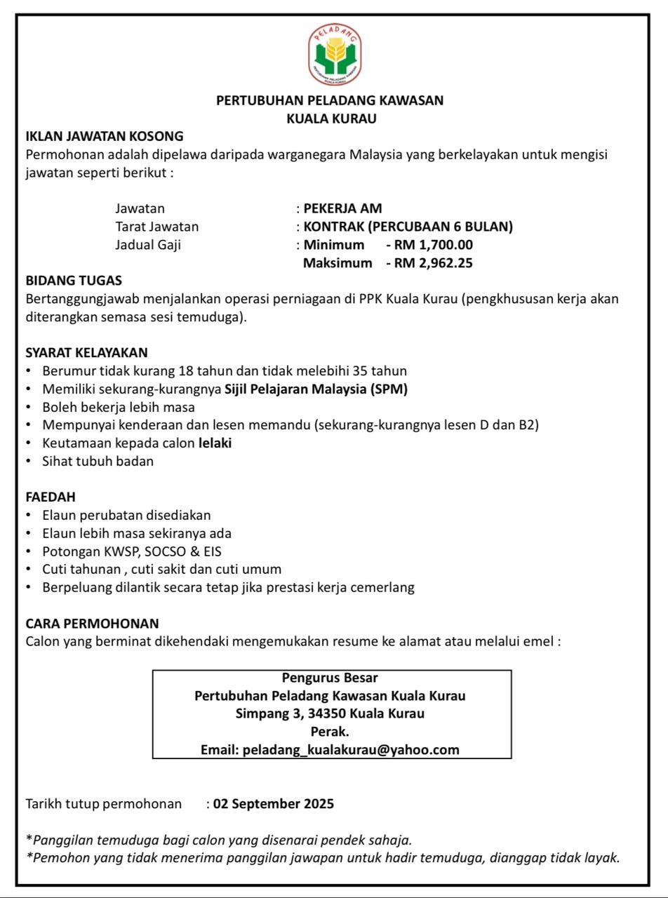 Iklan Jawatan Pertubuhan Peladang Kawasan Kuala Kurau