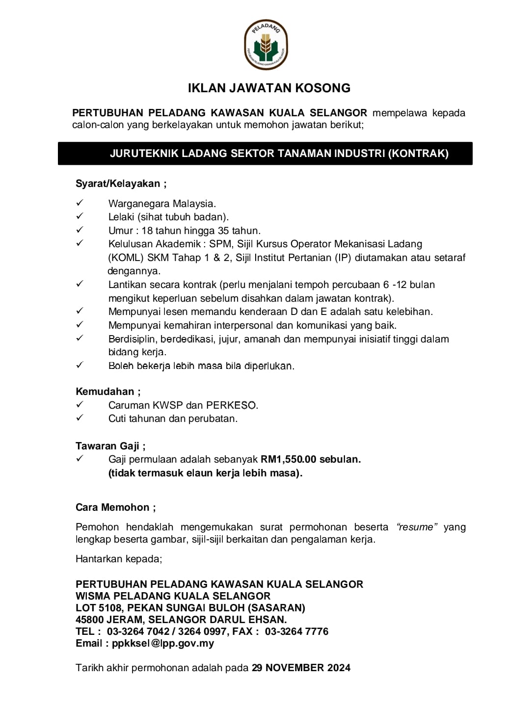 Iklan Jawatan Pertubuhan Peladang Kawasan Kuala Selangor