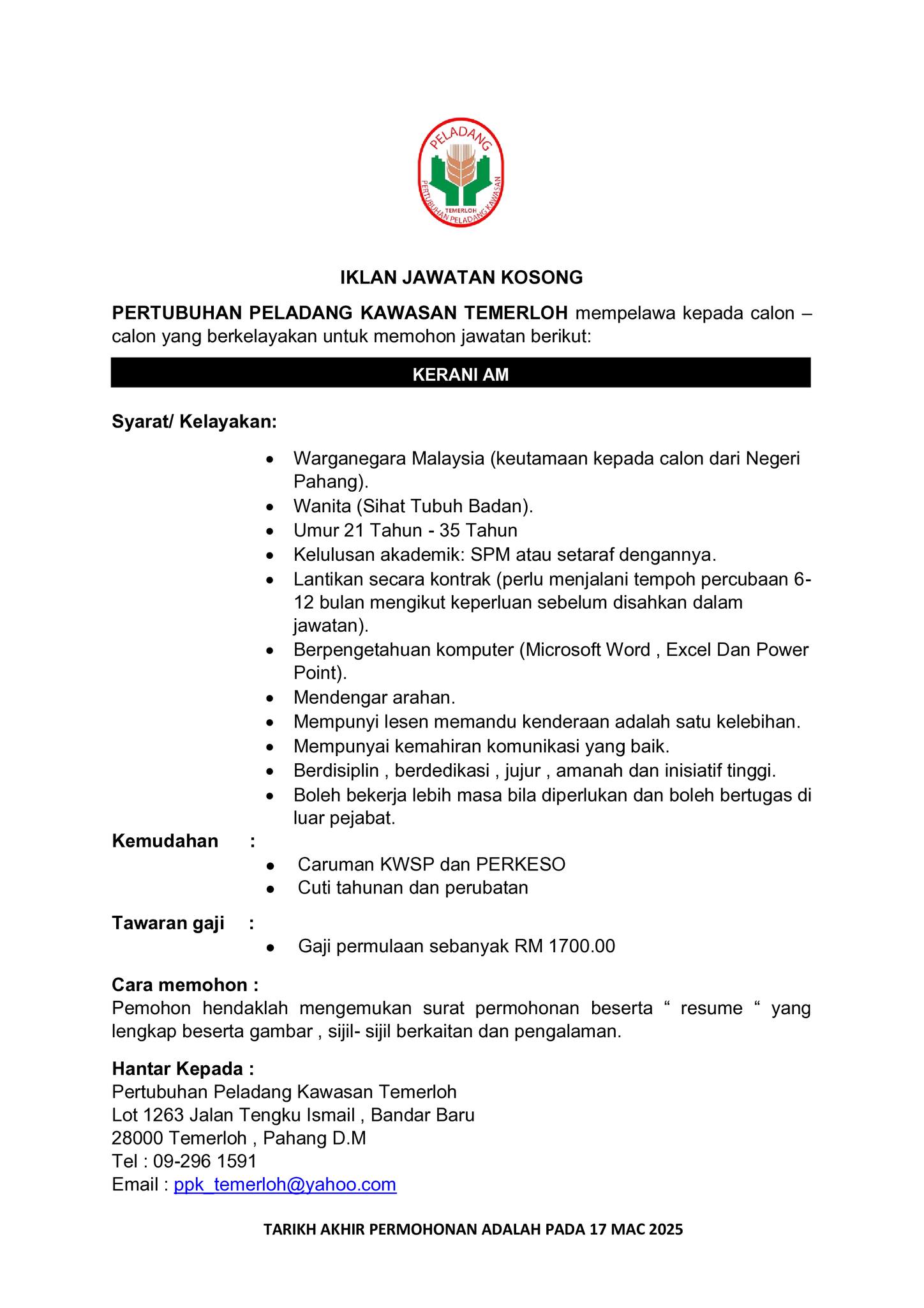 Iklan Jawatan Pertubuhan Peladang Kawasan Temerloh