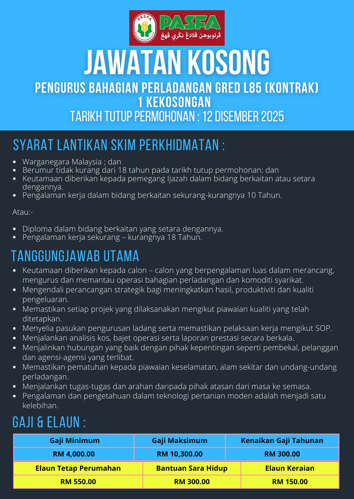 Iklan Jawatan Pertubuhan Peladang Negeri Pahang (PASFA)