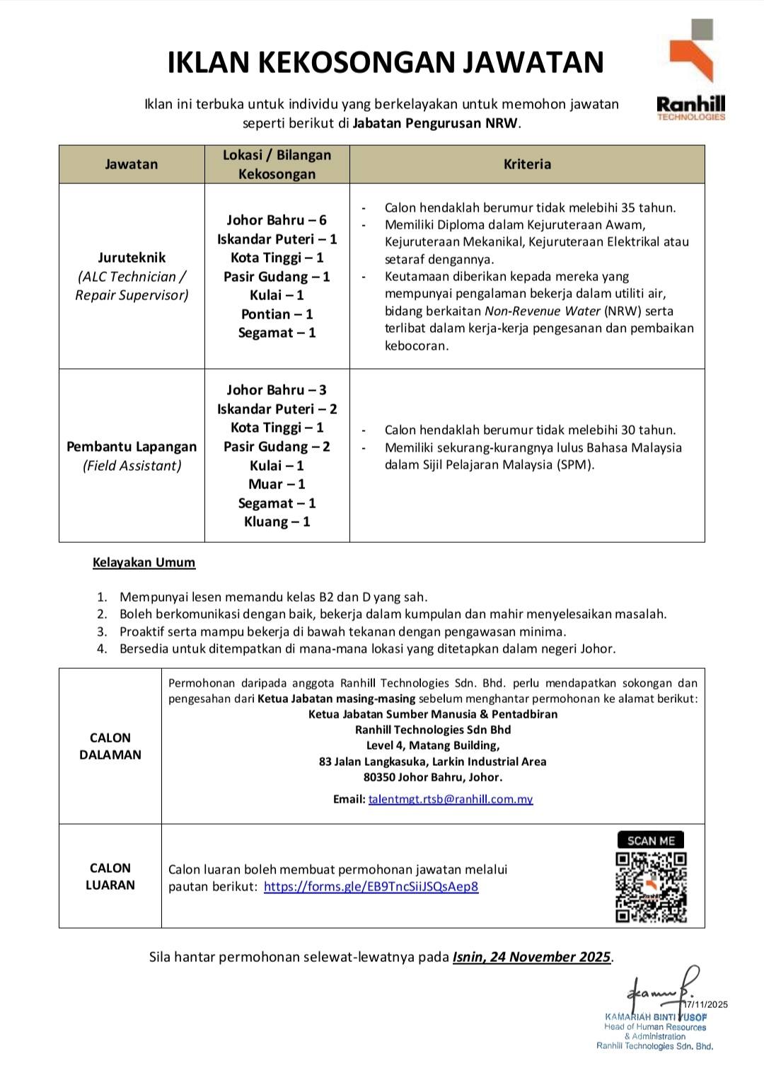 Iklan Jawatan Pihak Ranhill Technologies Sdn Bhd