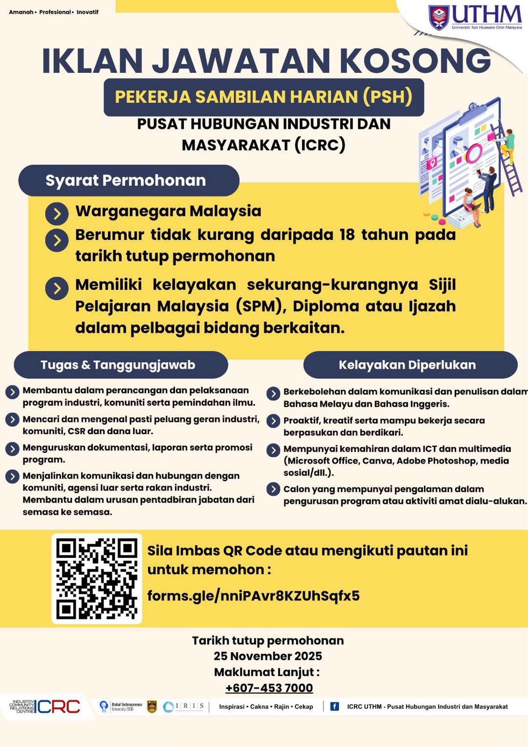 Iklan Jawatan Pusat Hubungan Industri dan Masyarakat (ICRC), UTHM