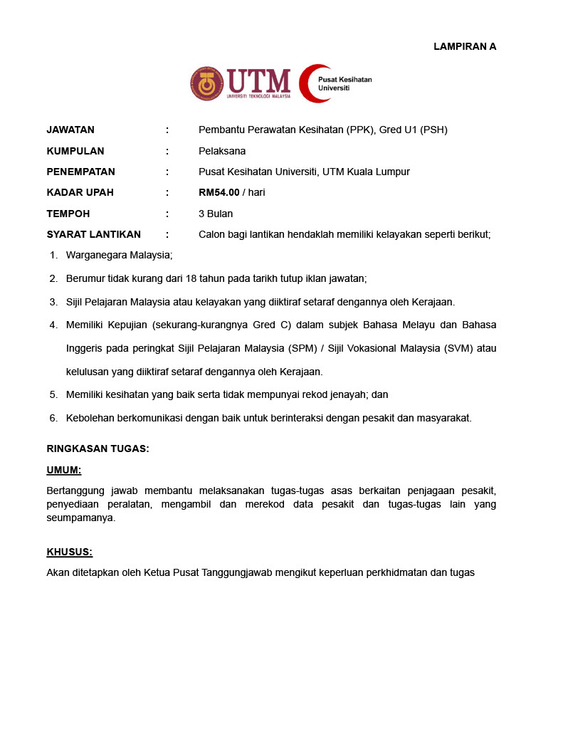 Iklan Jawatan Pusat Kesihatan Universiti, UTM Kuala Lumpur