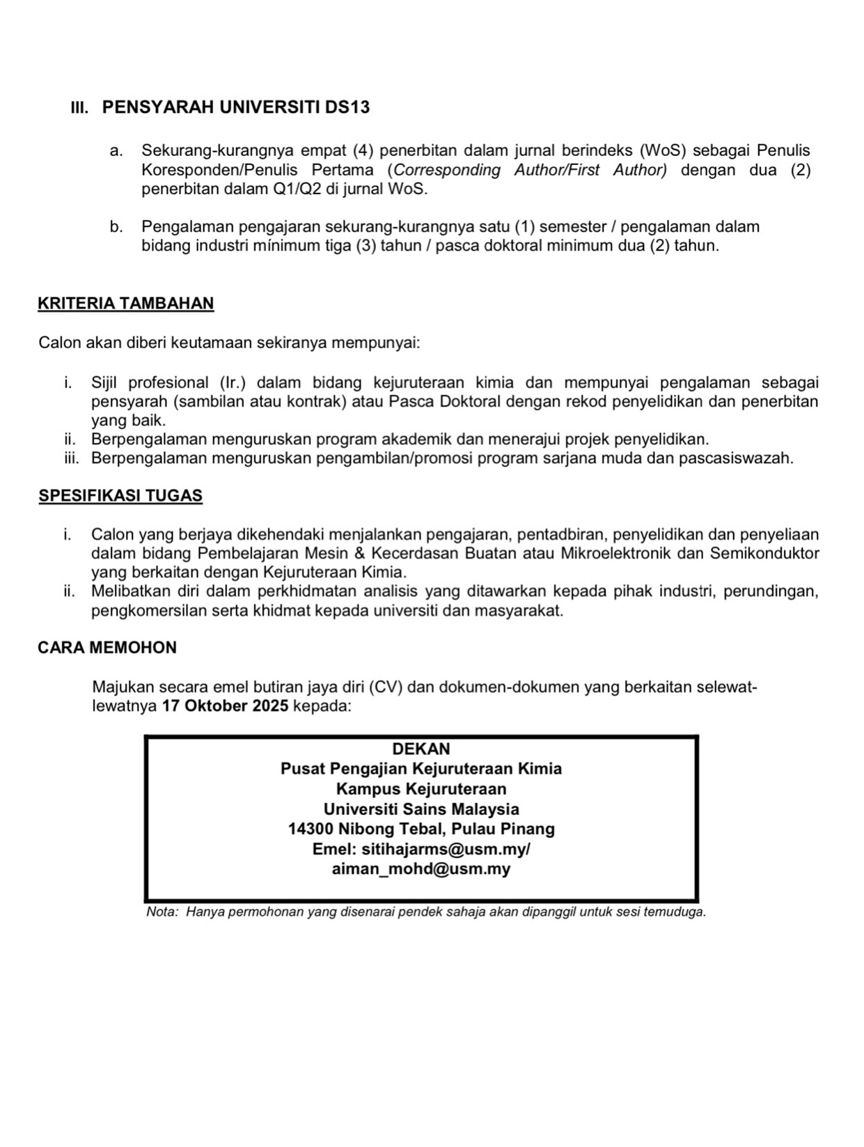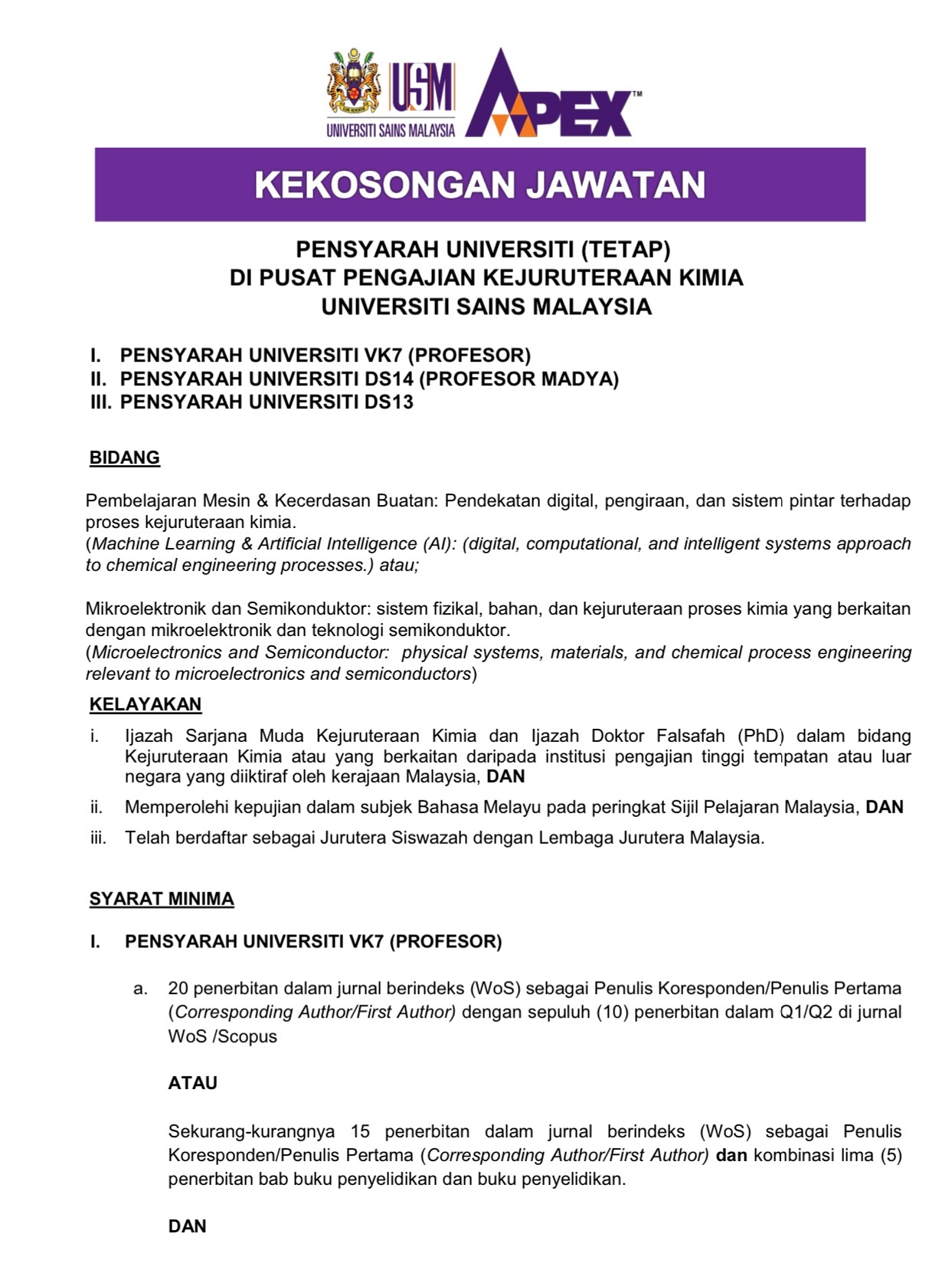 Iklan Jawatan Pusat Pengajian Kejuruteraan Kimia, Universiti Sains Malaysia (USM)