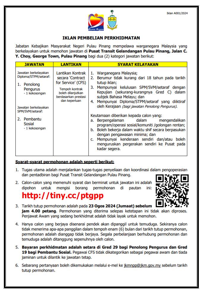 Iklan Jawatan Pusat Transit Gelandangan Pulau Pinang, Jabatan Kebajikan Masyarakat (JKM) BORANG PERMOHONAN