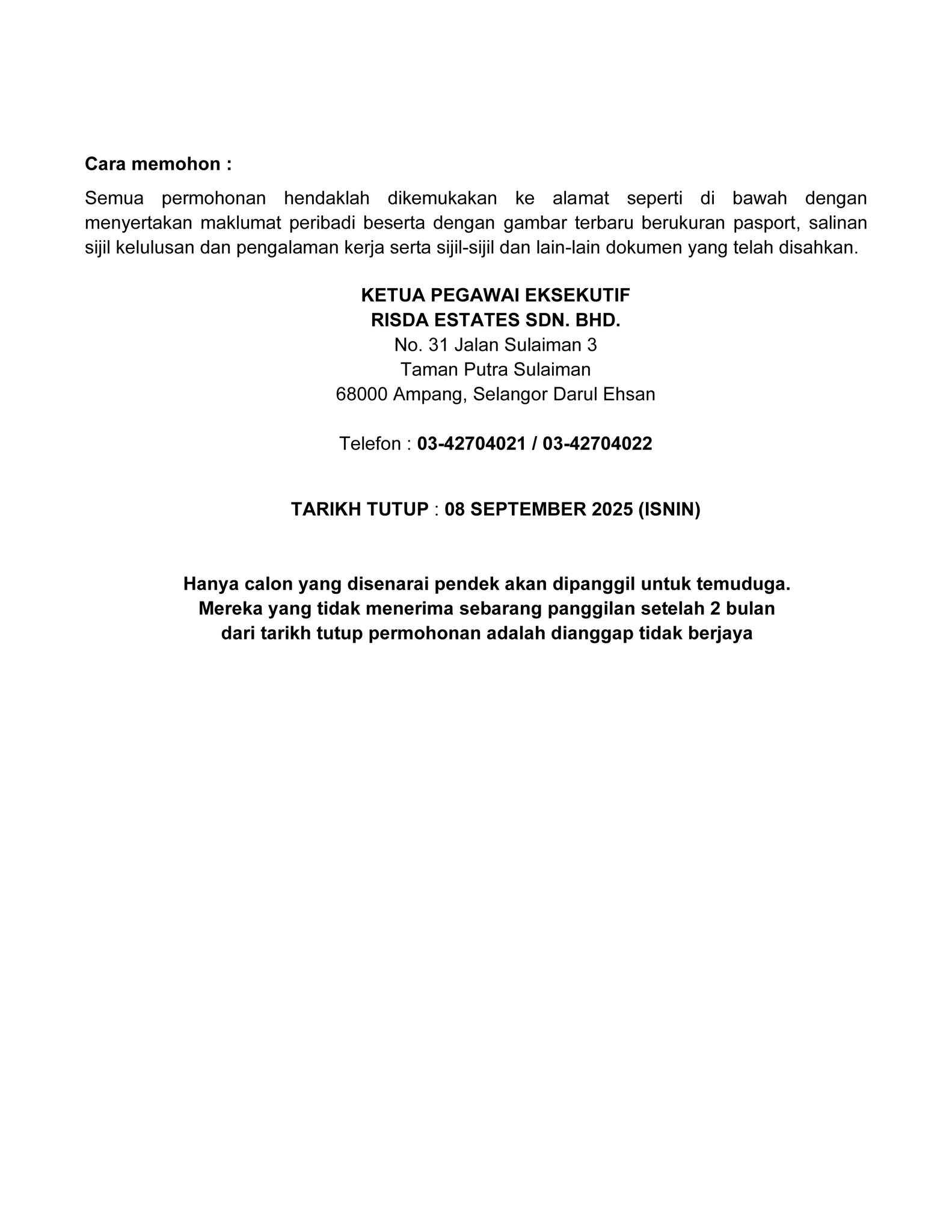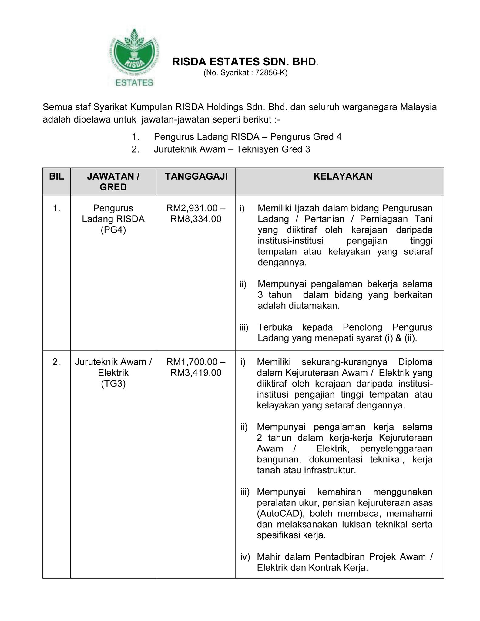 Iklan Jawatan RISDA Estates Sdn Bhd