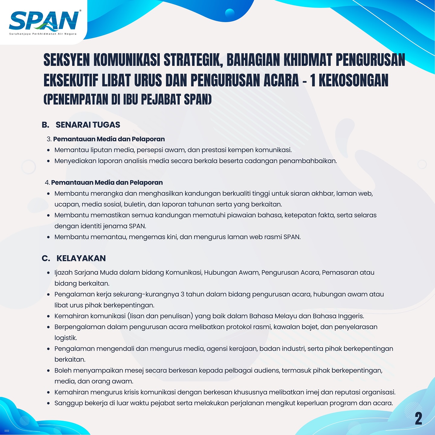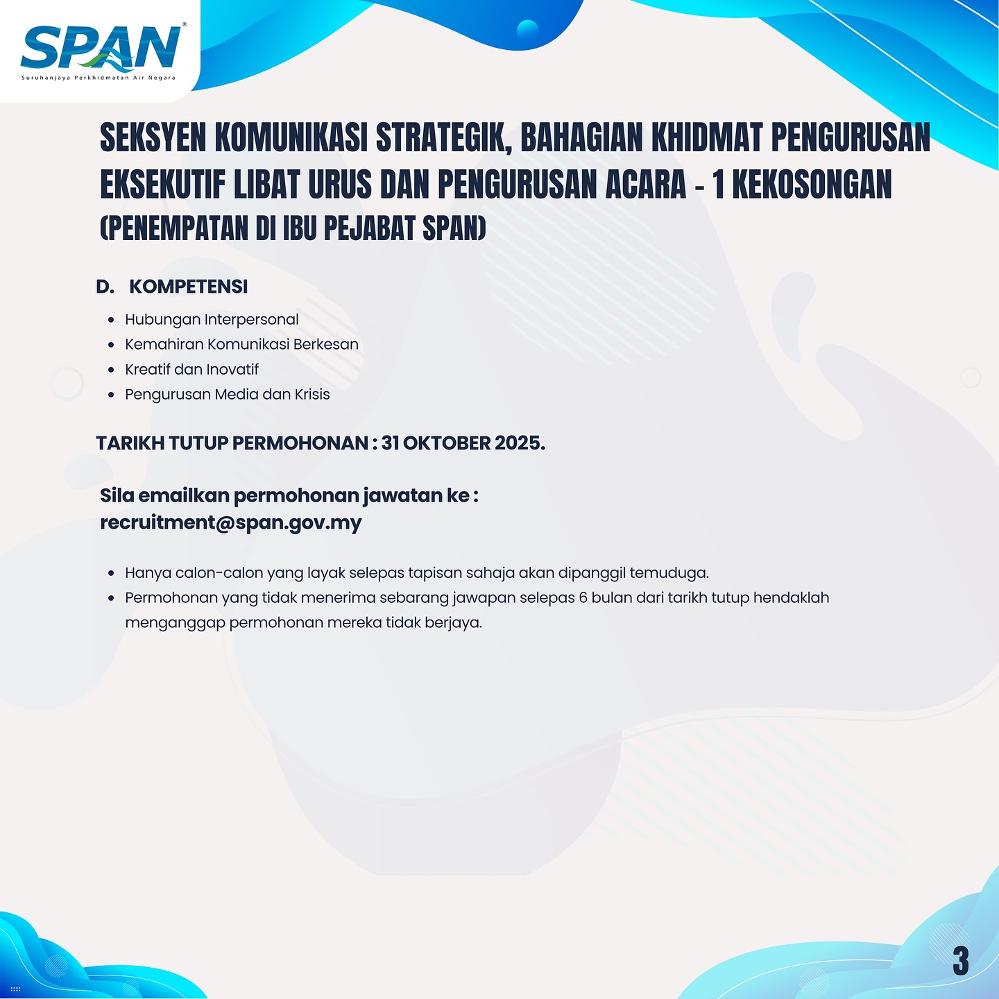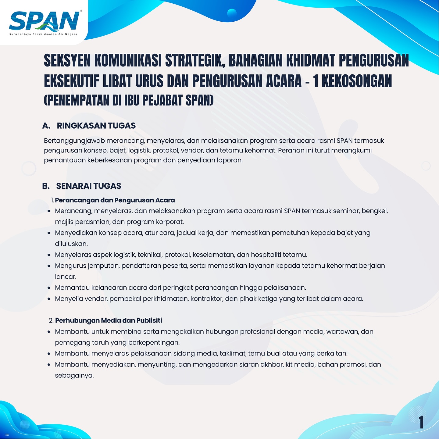 Iklan Jawatan Suruhanjaya Perkhidmatan Air Negara (SPAN)