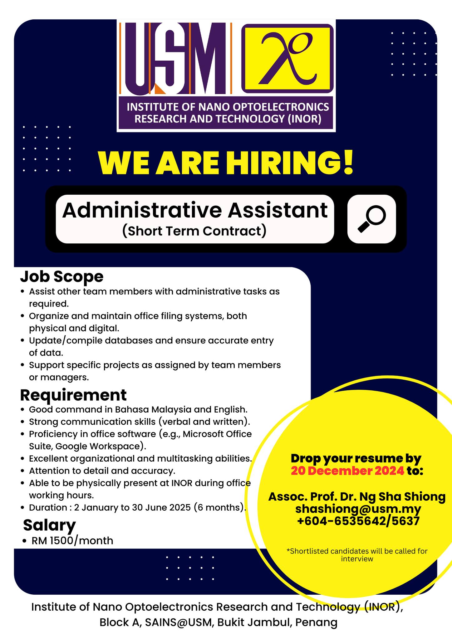 Iklan Jawatan The Institute Of Nano Optoelectronics Research And Technology (INOR), Universiti Sains Malaysia (USM)