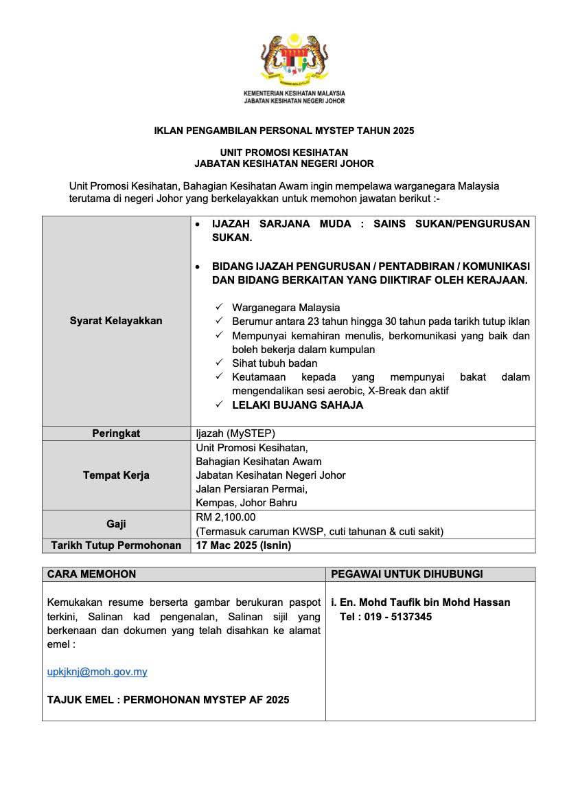 Iklan Jawatan Unit Promosi Kesihatan, Bahagian Kesihatan Awam, Jabatan Kesihatan Negeri Johor