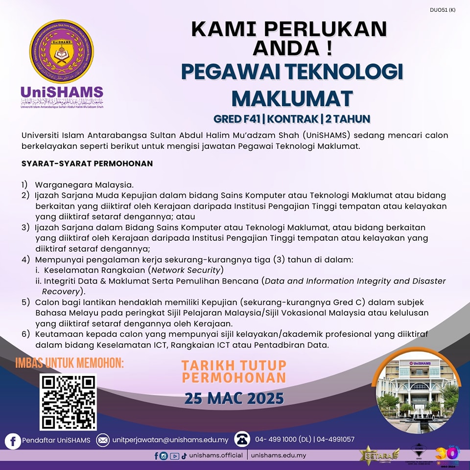 Iklan Jawatan Universiti Islam Antarabangsa Sultan Abdul Halim Mu’adzam Shah (UniSHAMS) RUJUKAN IKLAN