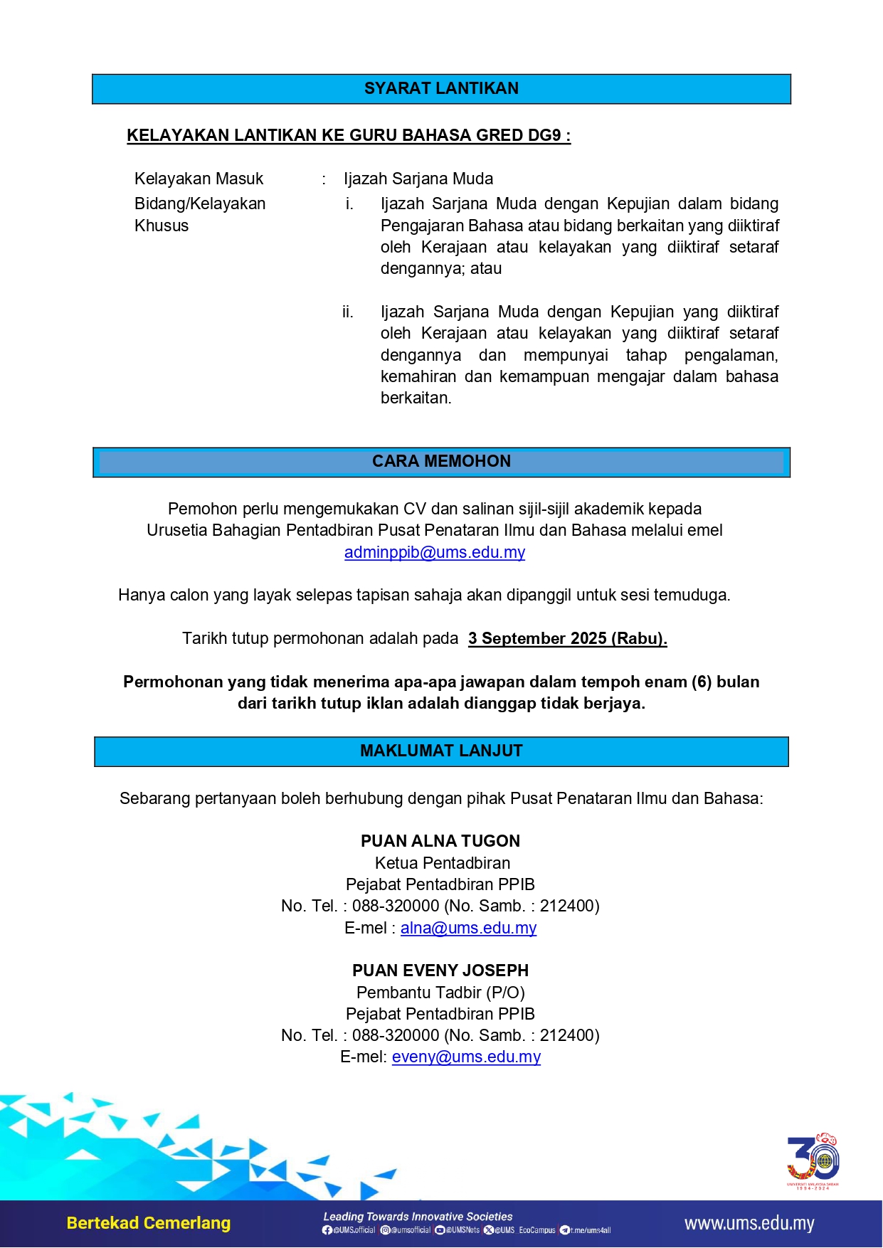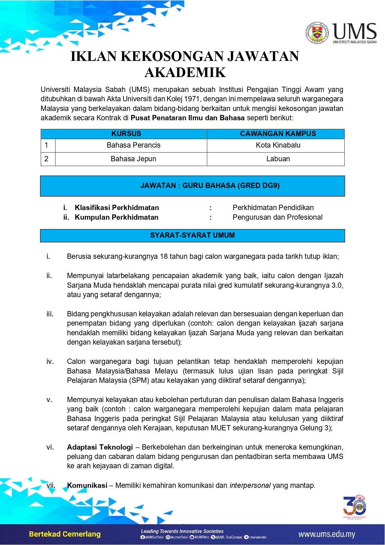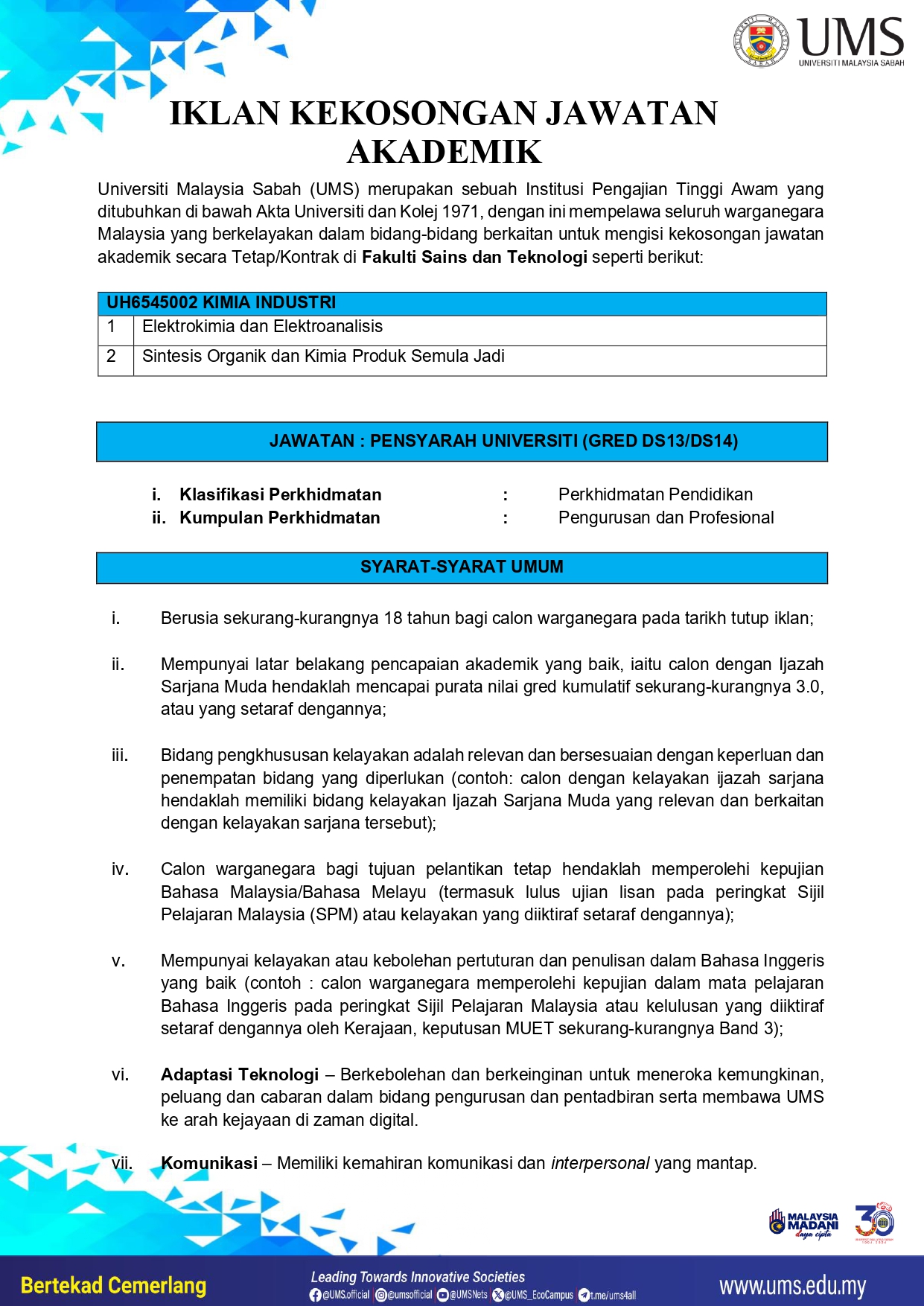 Iklan Jawatan Universiti Malaysia Sabah (UMS)